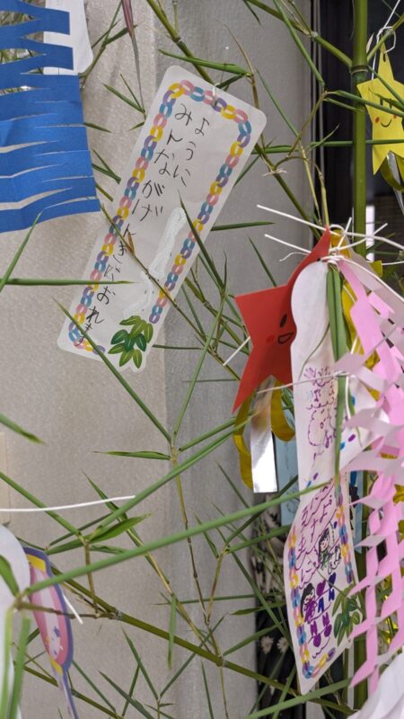 7月7日は七夕🎋 今年もまた雨ですが、、、今日は七夕★ 子どもたちに短冊を書いてもらいました。 「うーん…なににしようー。」と悩みながらも サッカーが、野球が、泳ぎが等『上手になりますように』、 日本代表にや、アイスクリーム屋さんに等『なれますように』、 その他にもたくさんの願い事を見せてくれました。 みんなの願いが届きますように!!