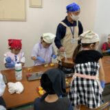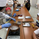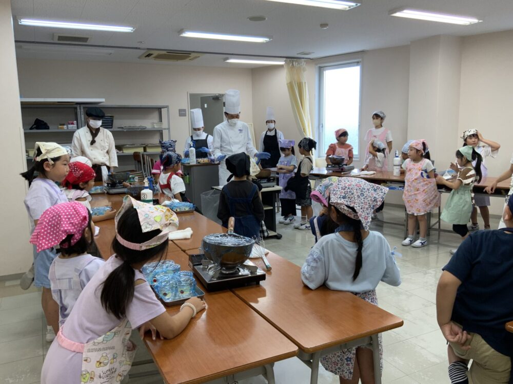 エプロン・三角巾をつけて、いつもとは違う雰囲気にみんなワクワク♪手を洗って、説明を聞いて、ゼリー作りスタート!!