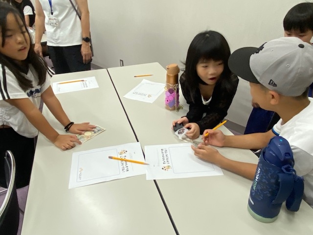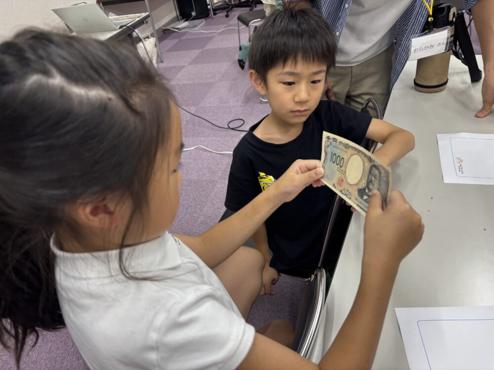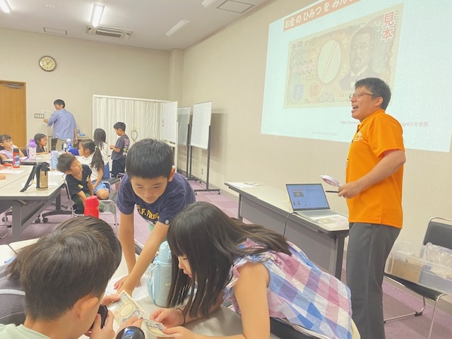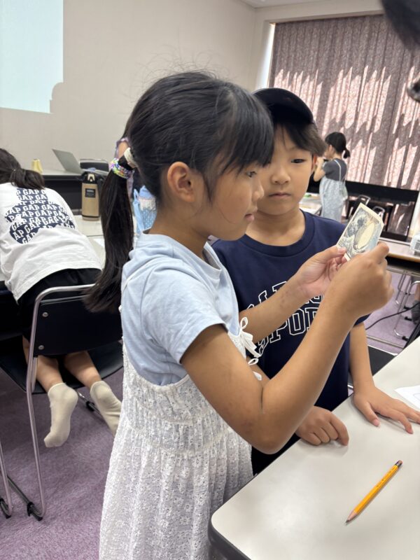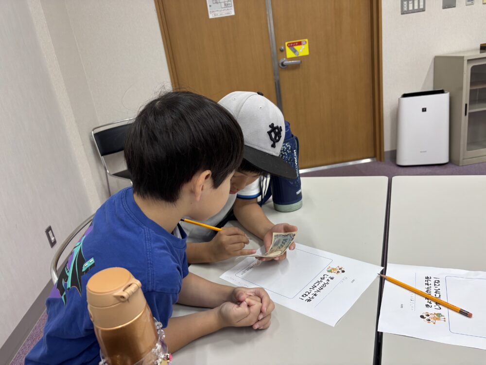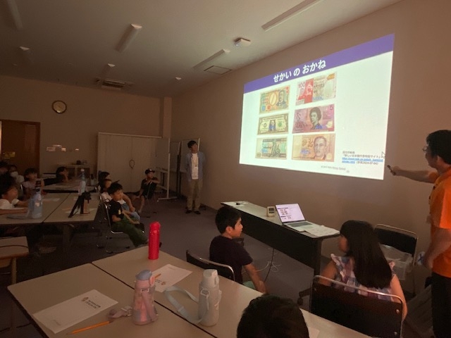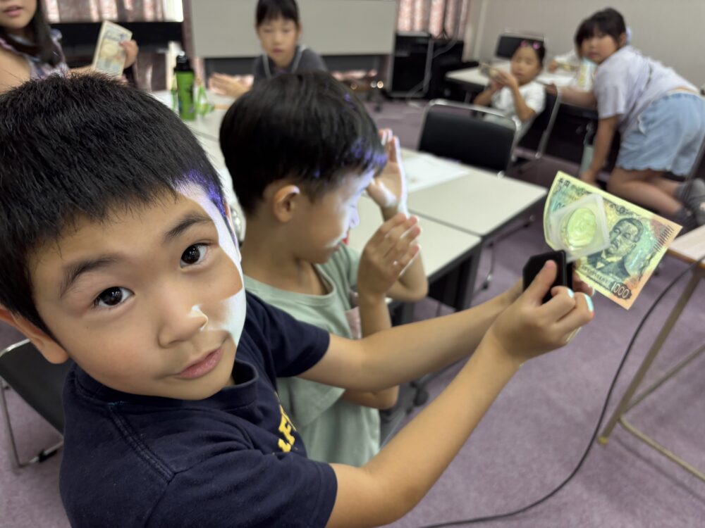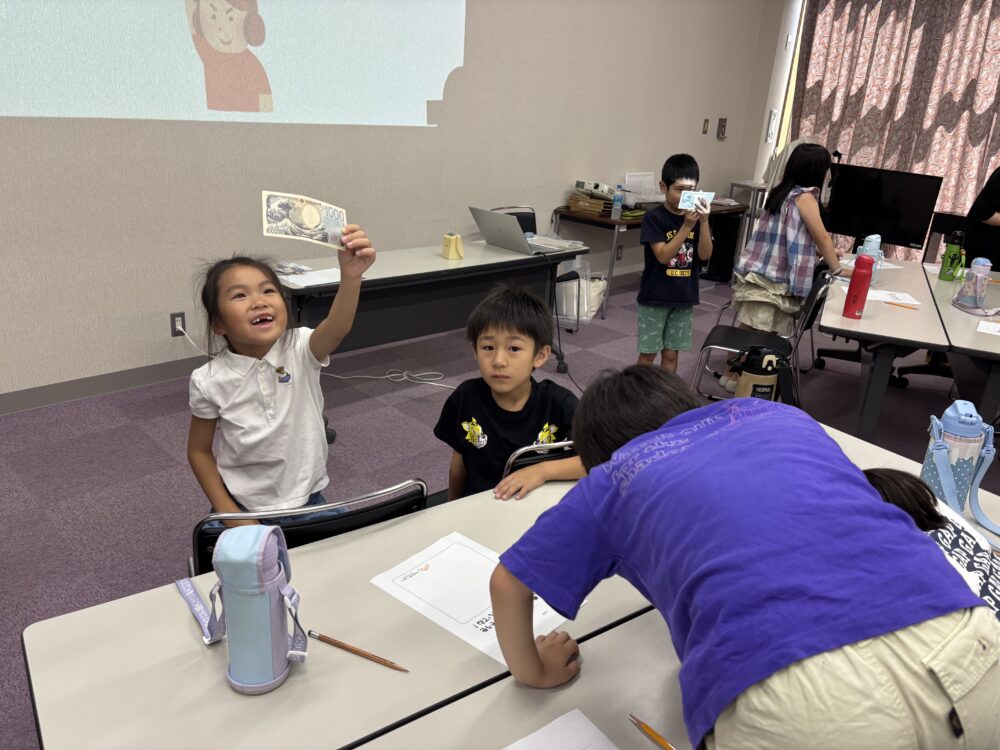 💰キッズ・マネー・スクール💴 🪙キッズ・マネー・スクール💰 ☆イベントプログラム第4弾☆ 8月19日にキッズマネースクール認定講師を迎え、子どもたちはお金クイズにチャレンジしながら、お金の成り立ちや基本知識について楽しく学びました。 子どもたちに正しい金銭感覚を身につけてもらうプログラムで、みんな日本のお金や世界のお金を見せてもらい、本物のお金か偽物のお金かルーペで楽しく確認していました。 お金が変化してきた歴史やお金の使い方、お金がどのようにお家にくるのかなど、まーしー先生のお話をみんな興味津々に聞き入っていました。