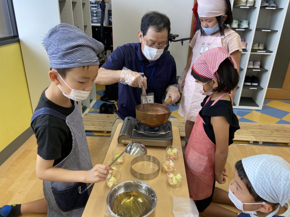 まずは、容器にフルーツを好きなように好きなだけ入れます(笑)それが終わると、ゼリー液作り!鍋を火にかけ、水の中にゼリーの元となる粉を入れ混ぜる。80℃程になると火を止め、リンゴジュースを入れる。そして、素早く混ぜ、カップに注ぐ、、、という手順でした。このゼリー液を作る工程では、コンロの上で鍋を抑えておく人、粉を入れる人、混ぜる人、リンゴジュースを入れる人、と役割分担をし、協力している姿が何とも微笑ましかったです!